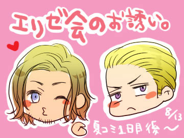 実は夏コミ当日休みがとれるかどうか今のところ少し厳しい(でももぎり取ります!きっと!)のですが、もうエリゼ会開かれるなら血反吐吐いて土下座してでも休み取ってやろうと思います。というわけで私も参加予定ですー!!きゃっきゃしたい!えりぜできゃっきゃしたい!!!!!
